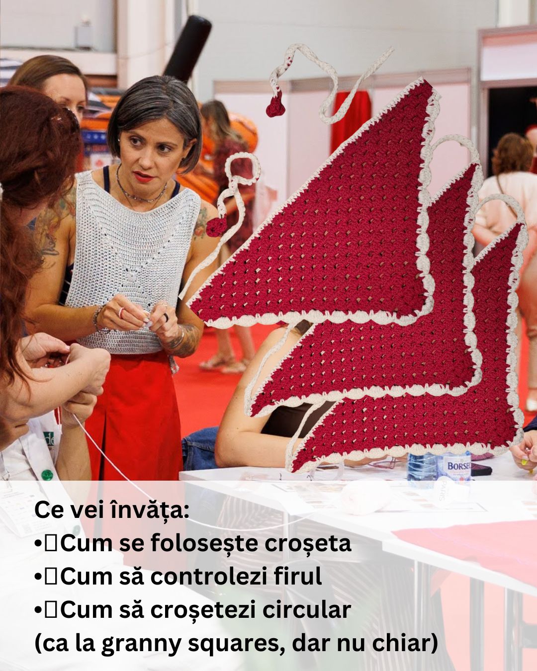 La atelier vom lucra croșetat circular, ca la granny squares, doar că de data asta pătratul s-a hotărât să devină triunghi. Nu-ți face griji, nu e matematică avansată, e relaxant și chiar dă ușoară dependență. Atelierul e gândit special pentru începători, deci e perfect chiar dacă relația ta cu croșeta e una timidă.